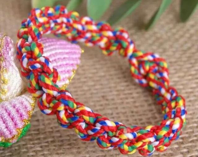 五彩绳,红绿黄白黑五种颜色编制。